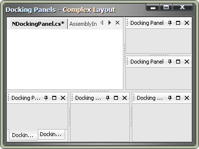 | Nevron Docking Panels are extremely rich regarding layout features. Unlimited nesting of panels and groups is supported. Using the Visual Studio Designer, building sophisticated layouts of user interfaces is a snap. |